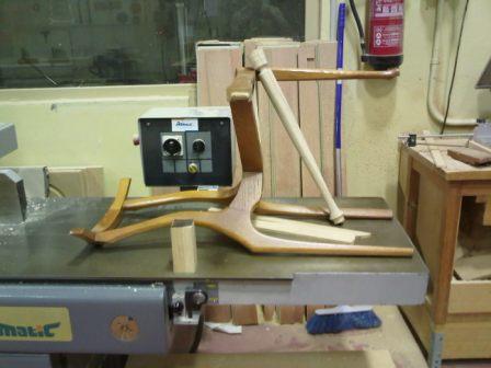Aquí està! com en un quiròfan, damunt de la taula d'obrar la fusta, ja quasi tinc la pota tornejada, falta fer-li l'implant de la pota i millorar-ne l'acabat.