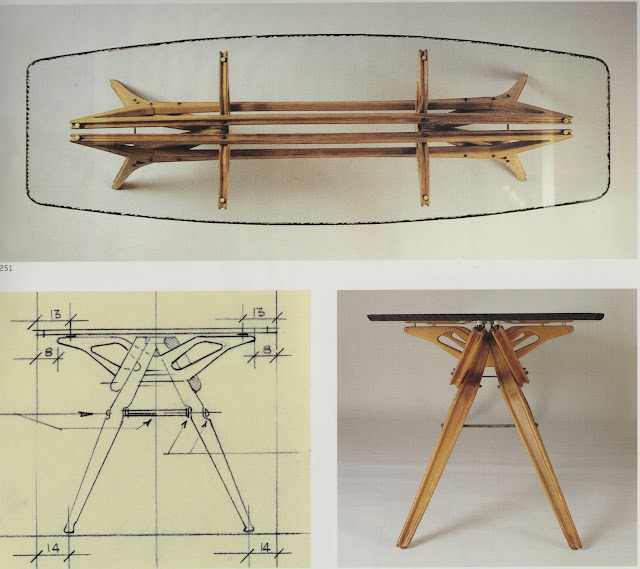 Els mobles de Carlo Mollino son molt escultorics, s'asemblen molt als esquelets d'animals, peixos a estructures molt ben proporcionades i estudiades per al seu comportament. A mi m'agrada molt la taula Reale de 1946 que ara edita Zanotta (www.zanotta.it).
